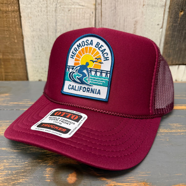 Hermosa Beach 1 to 3 FEET HIGH & RISING High Crown Trucker Hat - Burgundy Maroon