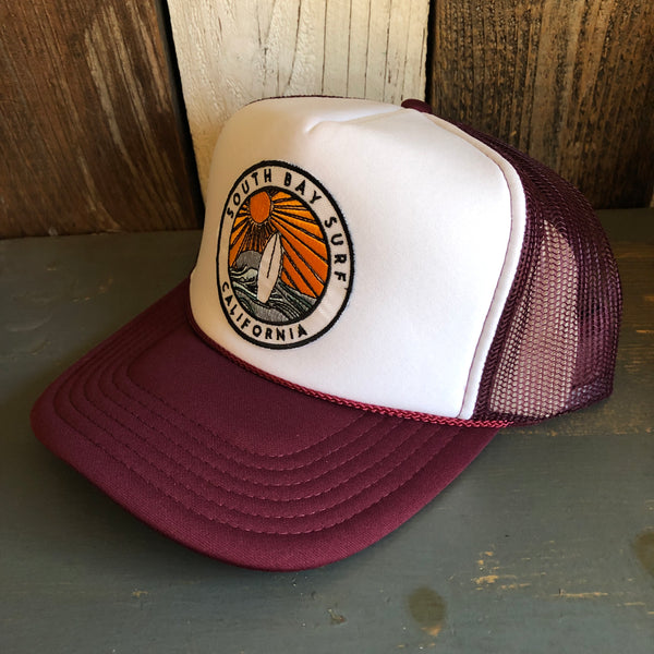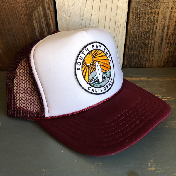 Hermosa Beach SOUTH BAY SURF (Multi Colored Patch) Trucker Hat - Maroon/White/Maroon