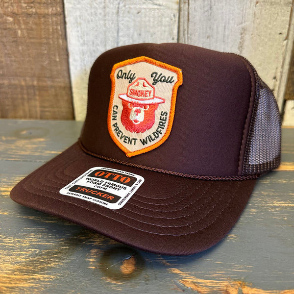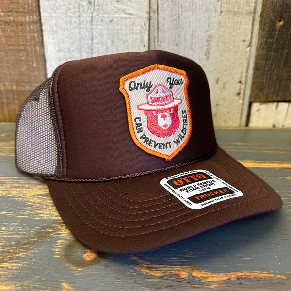 SMOKEY BEAR :: ONLY YOU CAN PREVENT WILDFIRES High Crown Trucker Hat - Brown