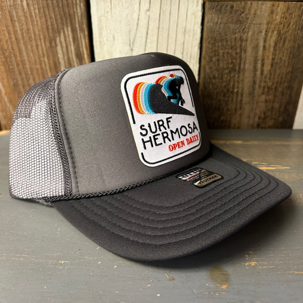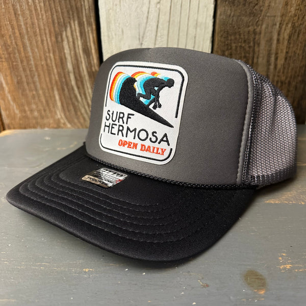 Hermosa Beach SURF HERMOSA :: OPEN DAILY Trucker Hat - Charcoal/Black (Curved Brim)