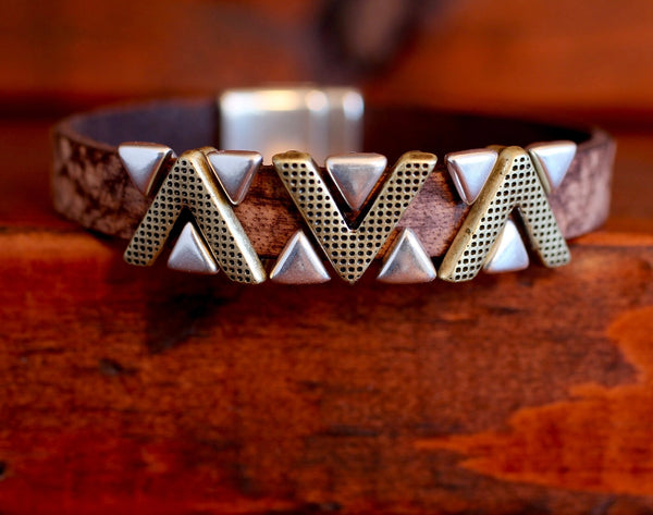 Handmade item Bracelet length: 8 Inches; Bracelet width: 10 Millimeters Materials: Leather, Stainless steel Style: Boho & hippie Handsome slider bracelet in silver and brass on antiqued brown leather. This bracelet is inspired by the mountain ranges in Tucson that sing to me each year when I travel there. Women's or men's sizing.