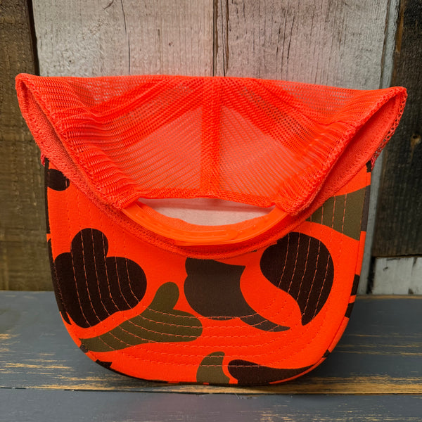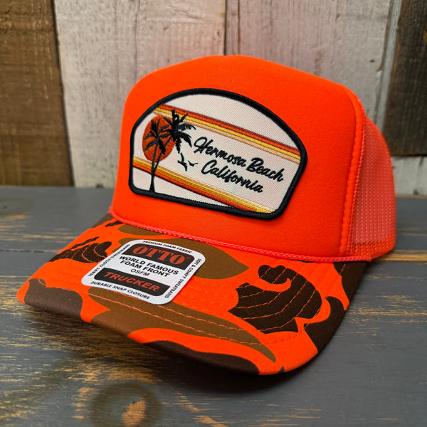 Hermosa Beach RETRO SUNSET High Crown Trucker Hat - Neon Orange Camo/Orange Backing