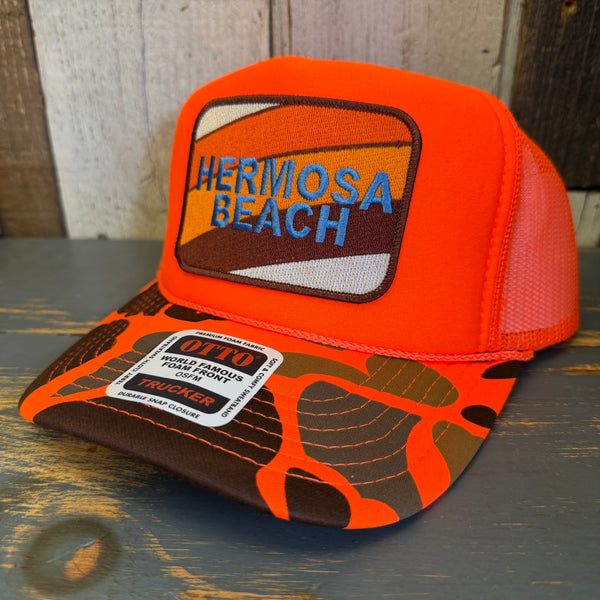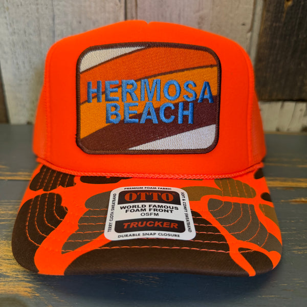Hermosa Beach GOLF CARTS & YOGA PANTS High Crown Trucker Hat - Neon Orange Hunters Camo/Orange Backing