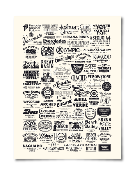 Designer and friend-of-the-brand Steve Wolf arranged all 63 parks with unique type treatments interlocking into one compelling graphic. Get lost in the details as you spot your favorite national park among the designs and get inspired to visit another!