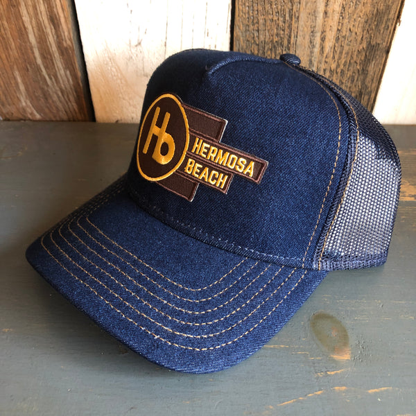 Hermosa Beach THE NEW STYLE Premium Denim Trucker Hat - Navy/Gold Stitching