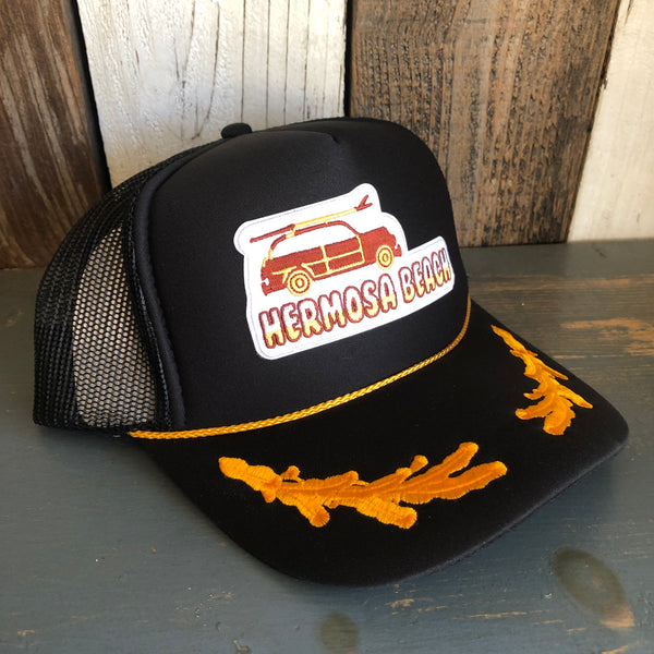 Hermosa Beach WOODIE 5 Panel High Crown Mesh Back Captain Trucker Hat- Black/Gold