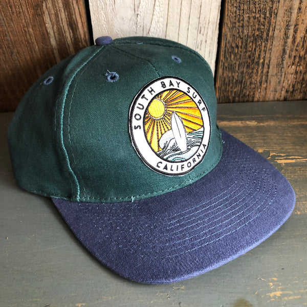 SOUTH BAY SURF (Multi Colored Patch) - 6 Panel Low Profile Baseball Cap with Adjustable Strap with Press Buckle - Dark Green/Navy
