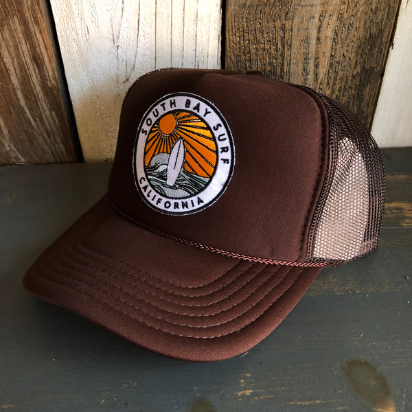 SOUTH BAY SURF (Multi Colored Patch) High Crown Trucker Hat - Brown