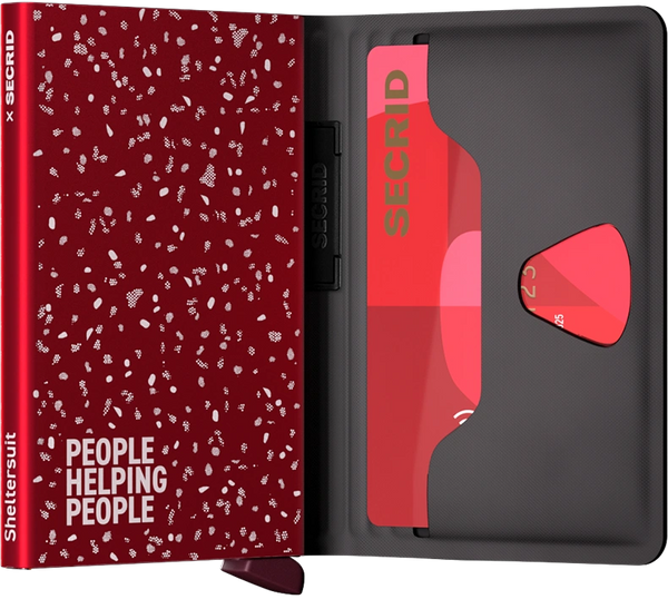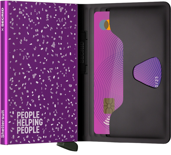 The Bandwallet has an upcycled aluminium Cardprotector, with the engraving 'People Helping People'. Designed in collaboration with Sheltersuit Foundation.