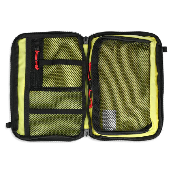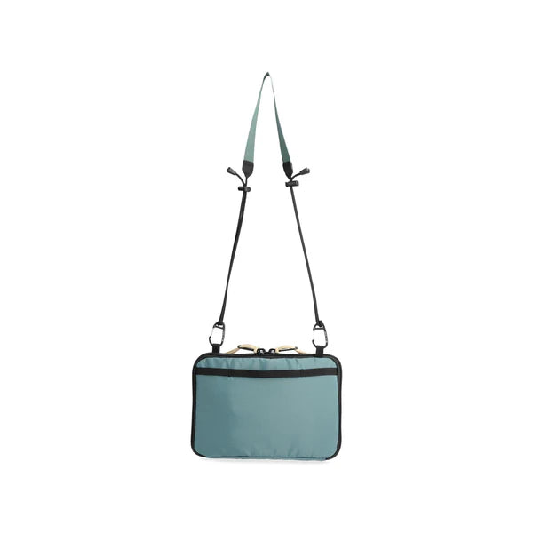 The All Adventure Accessory Bag carries essentials for travel or outdoor activities. Made from 100% recycled nylon, it blends functionality and sustainability, folding flat for easy organization.