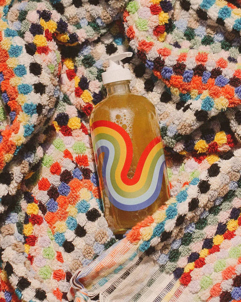 Respect yourself with our naturally radical, certified-organic, all-purpose soap in a 16oz rainbow glass bottle. Included in this years' Goop holiday gift guide, among others. Available with plastic pump top, or go plastic-free with a metal cap.