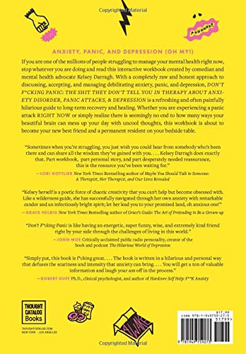 This book covers all those worries and fears that they don’t tell you about in therapy or the things you’re too embarrassed to talk to your doctor about: the thought that you’re “going crazy,” the wave of poo you get after a panic attack, the passive thought of wanting to die sometimes—THIS BOOK ISN’T AFRAID OF YOU AND YOUR BEAUTIFUL BRAIN!! Don’t F*cking Panic is your mental health manual. It is meant to be carried with you and pulled out the moment you need support. There are honest-as-shit tips, tricks, exercises, and stories covering our holy trinity of mental health disorders: ANXIETY DISORDER, PANIC ATTACKS, and DEPRESSION!