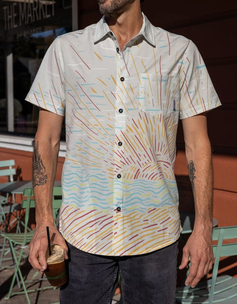 The Vagabond Button-Up is crafted from our signature recycled Vagabond™ poly blend stretch fabric - lightweight, breathable, wrinkle-resistant, and built to move. Designed for modern explorers, it features custom artwork, a hidden side-zip pocket for your essentials, and rugged construction that handles every season with style and ease.