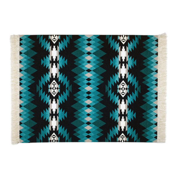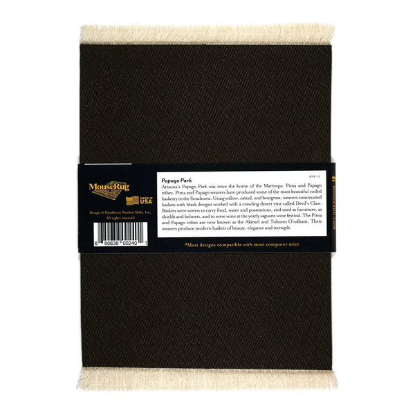 Arizona’s Papago Park was once the home of the Maricopa, Pima, and Papago tribes. Pima and Papago weavers have produced some of the most beautiful coiled basketry in the Southwest. Using willow, cattail, and beargrass, weavers constructed baskets with black designs that worked with a crawling desert vine called Devil’s Claw. Baskets were woven to carry food, water, and possessions, and used as furniture, as shields and helmets, and to serve wine at the yearly saguaro wine festival. The Pima and Papago tribes are now known as the Akimel and Tohono O’odham. Their weavers produce modern baskets of beauty, elegance, and strength. Design © Pendleton Woolen Mills, Inc. Made in the USA. Mouse Rug® dimensions - approximate finished size: 7.125" x 10.25" (including fringe) and .16" thick.