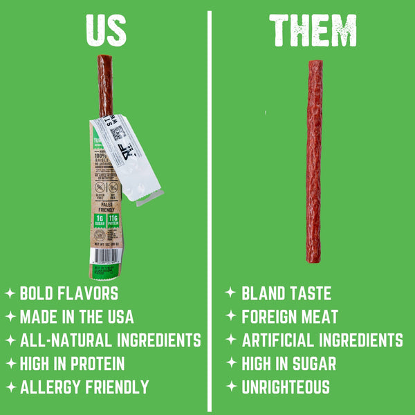 An homage to Bourbon Franklin's favorite fowl, this 100% turkey stick is dusted with pepper and basil, and finished with a tart twist of lemon. Have you heard? This bird is the word. Take flight with our healthy turkey jerky snack stick.