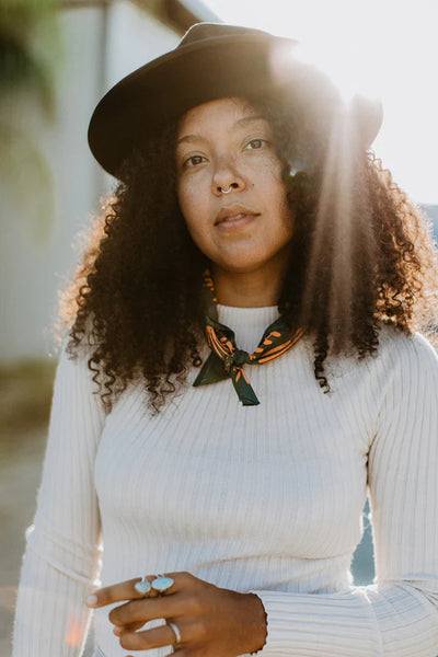 Emily Kelley is an illustrator, block printer, artist, and founder of Land and She Studio based in Philadelphia, PA. Land and She sells prints and goods featuring Emily's work and was founded on the philosophy that handmade work, while it may take longer to produce, ultimately creates a stronger connection and value from the artist's hands to the customer's home. Emily's work is rooted in, as she explains, "The everyday around me." Whether it be a lonely dock at sunset, a butterfly in the park, or a majestic canyon at a National Park, Emily's incredibly tactile work feels decidedly of the Earth in any setting. In creating her hand-made masterpieces, Emily is driven by "finding the tiniest of inspirations in the patters of rock formations, or feeling small amongst a vast horizon... These are the things that keep me curious and looking for more." We instantly connected with Emily's uniquely tactile work since we were first introduced to it late in 2019. After being blown away by the amazing "Red Tail Hawk" bandana she created for our BANDITS x REI exclusive collection, we knew we had to work her again.