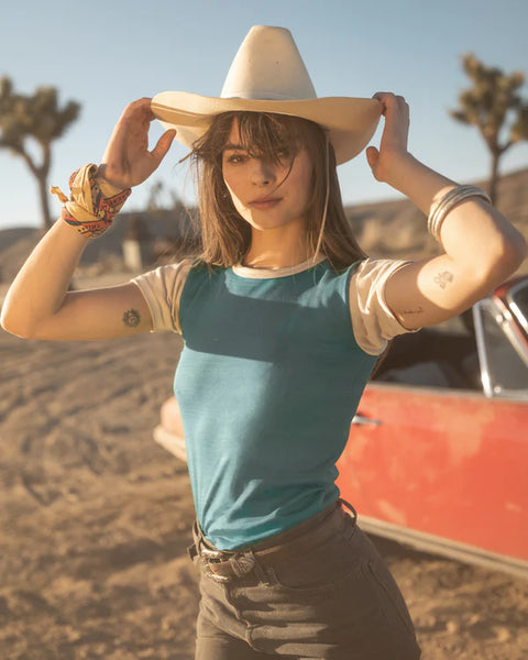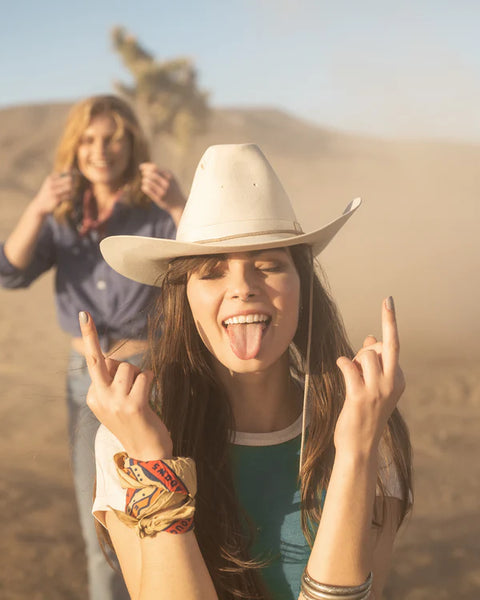a woman wearing a hata person with the arms raiseda woman wearing a hat and holding her hands upa man wearing a cowboy hat and sunglasses