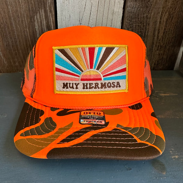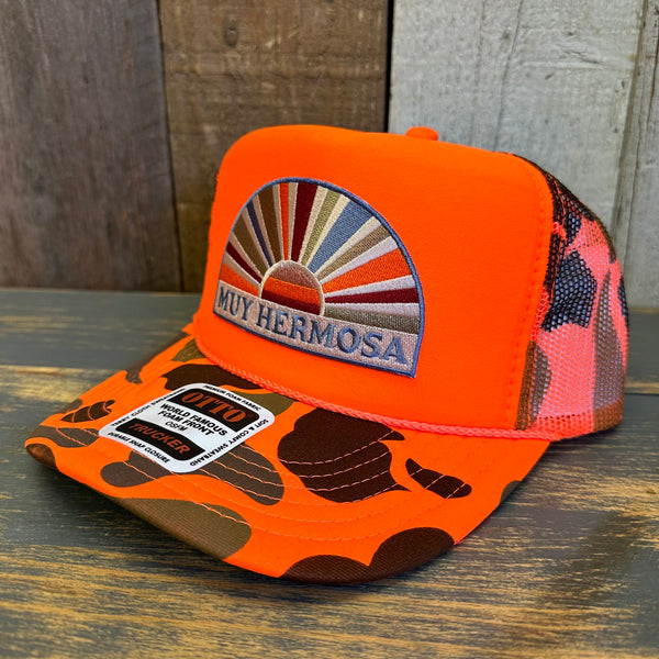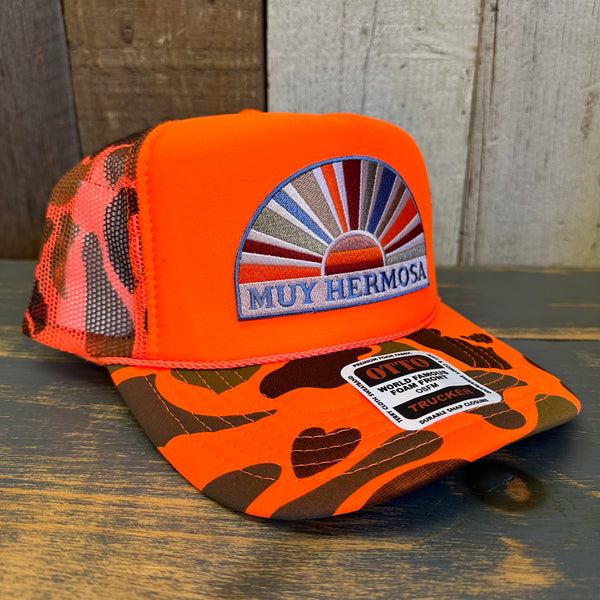 Hermosa Beach MUY HERMOSA High Crown Trucker Hat - Neon Orange Hunters Camo