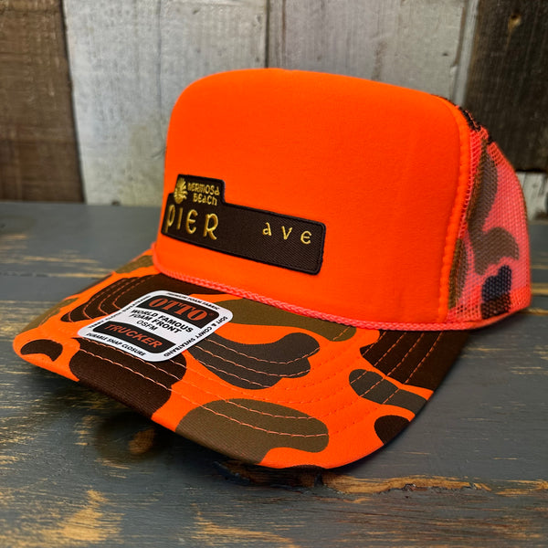 Hermosa Beach PIER AVE High Crown Trucker Hat - Neon Orange Hunters Camo