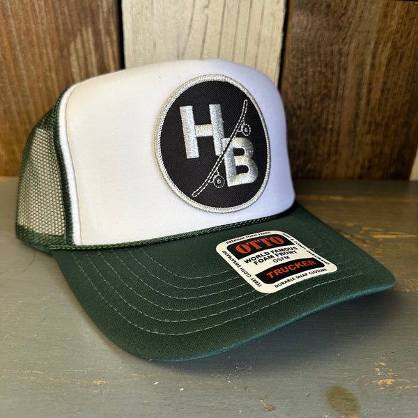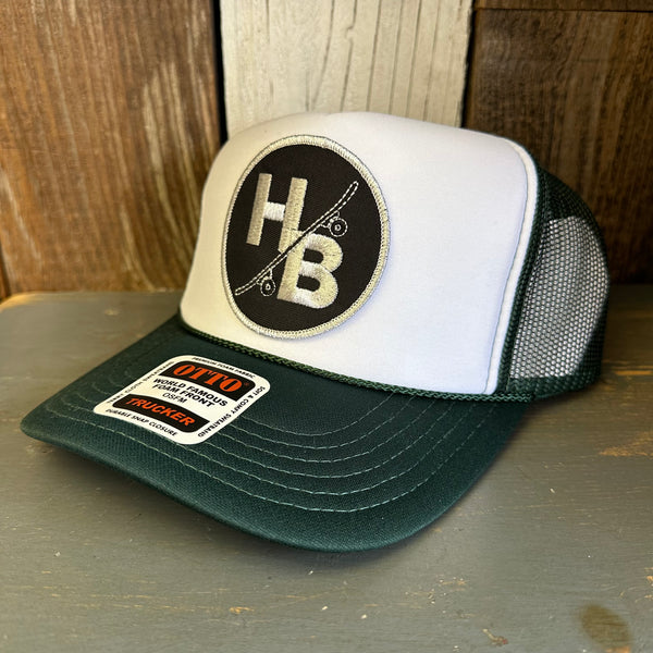 Hermosa Beach SKATEBOARDING WAS NEVER A CRIME High Crown Trucker Hat - Dark Green/White