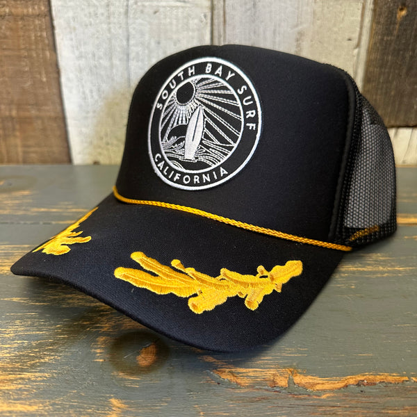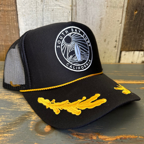 SOUTH BAY SURF (Black Patch) 5 Panel High Crown Mesh Back Captain Trucker Hat - Black/Gold
