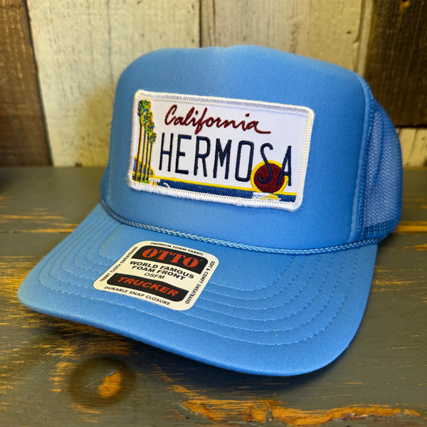 Hermosa Beach CALIFORNIA LICENSE PLATE High Crown Trucker Hat - Col. Blue