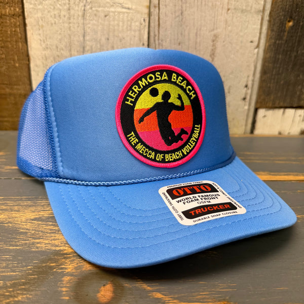 Hermosa Beach THE MECCA OF BEACH VOLLEYBALL High Crown Trucker Hat - Col. Blue