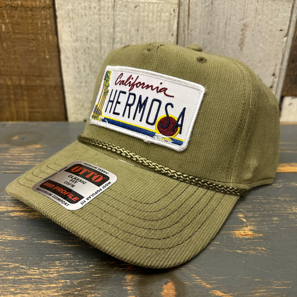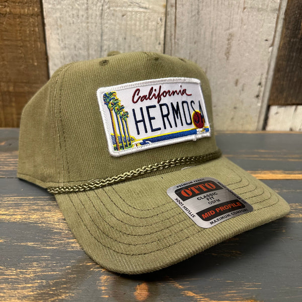 Hermosa Beach CALIFORNIA LICENSE PLATE 5 Panel Mid Profile Corduroy Baseball Cap - Olive Green