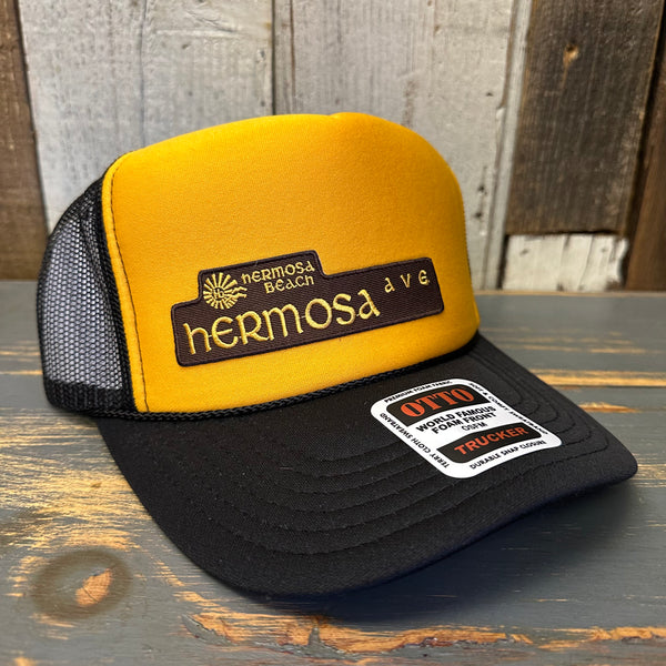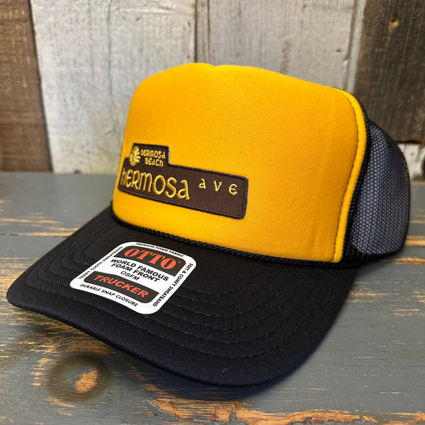 Hermosa Beach HERMOSA AVE 5 Panel High Crown Mesh Back Trucker Hat- Black/Gold