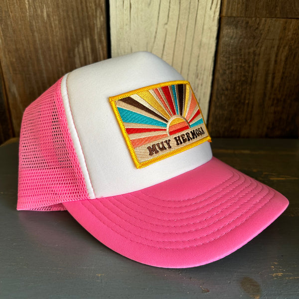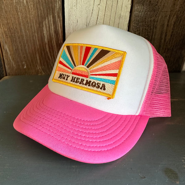 Hermosa Beach MUY HERMOSA High Crown 5 Panel Trucker Cap, Foam/Mesh - Neon Pink/White