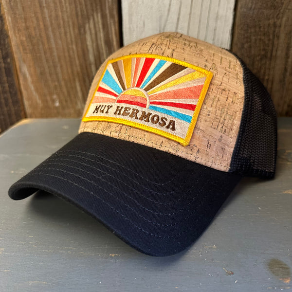 Hermosa Beach MUY HERMOSA Premium Cork Low Profile Mesh Back Trucker Hat - (Black/Cork)