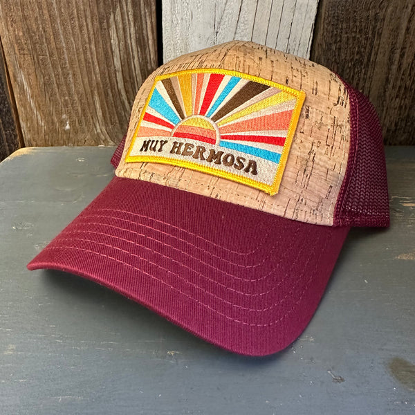 Hermosa Beach MUY HERMOSA Premium Cork Low Profile Mesh Back Trucker Hat - (Maroon/Cork)