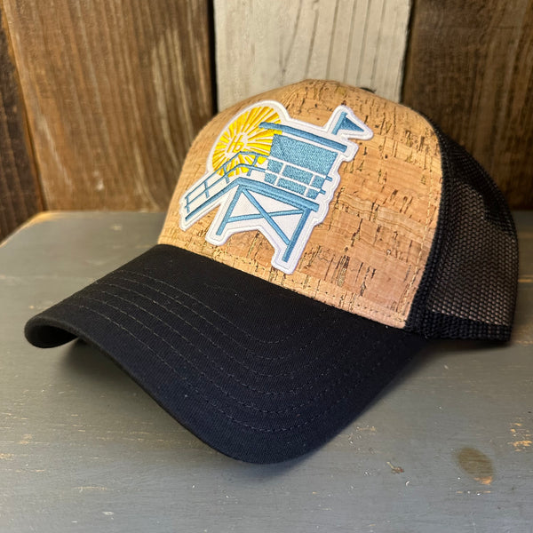 Hermosa Beach NORTH OF PIER LIFEGUARD TOWER Premium Cork Low Profile Mesh Back Trucker Hat - (Black/Cork)