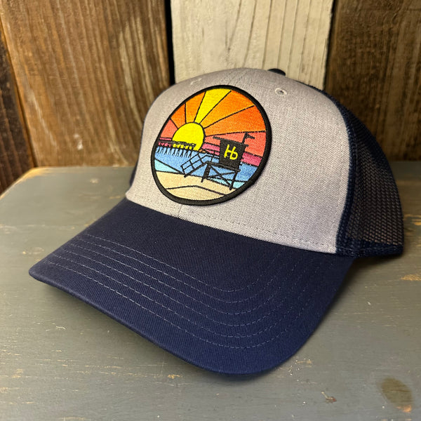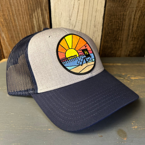 Hermosa Beach OBLIGATORY SUNSET 6 Panel Low Profile Mesh Back Trucker Hat - Navy/Heather Grey