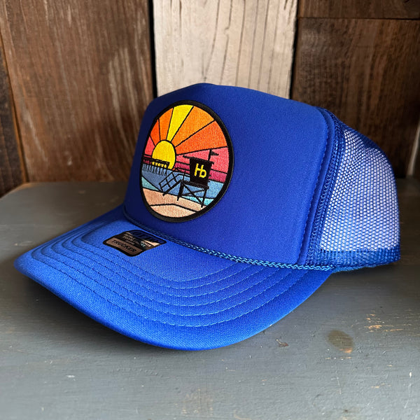 Hermosa Beach OBLIGATORY SUNSET High Crown Trucker Hat - Royal Blue (Curved Brim)