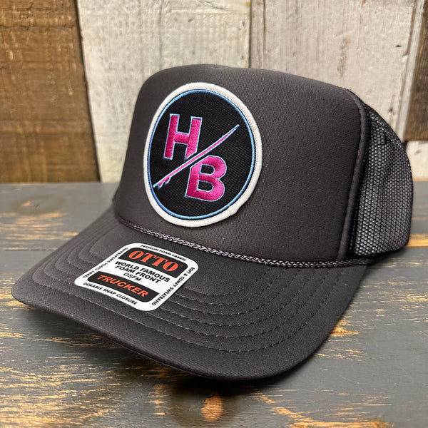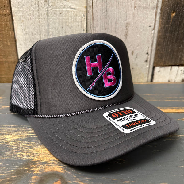 Hermosa Beach SO PITTED :: HB SURFBOARD High Crown Trucker Hat - Black/Charcoal/Black (Curved Brim)