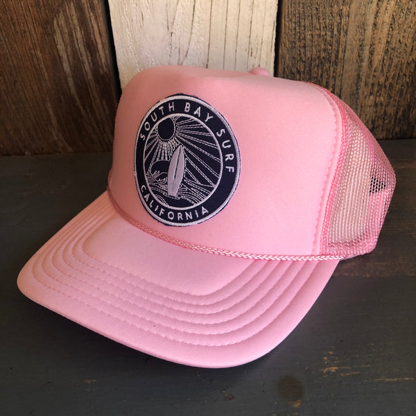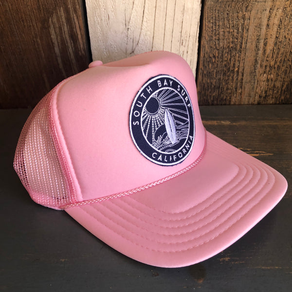 Hermosa Beach SOUTH BAY SURF (Navy Colored Patch) High Crown Trucker Hat - Pink
