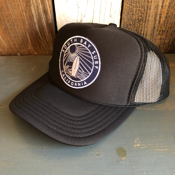 Hermosa Beach SOUTH BAY SURF (Navy Patch) High Crown Trucker Hat - Black (Curved Logo)