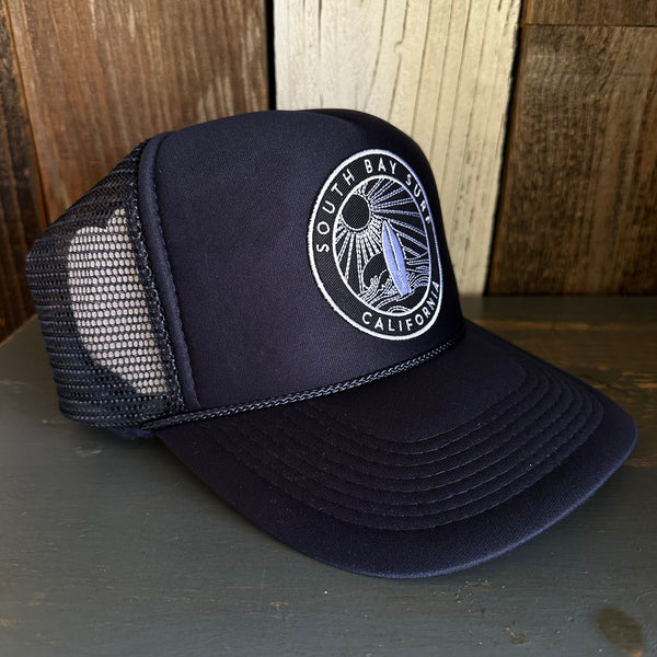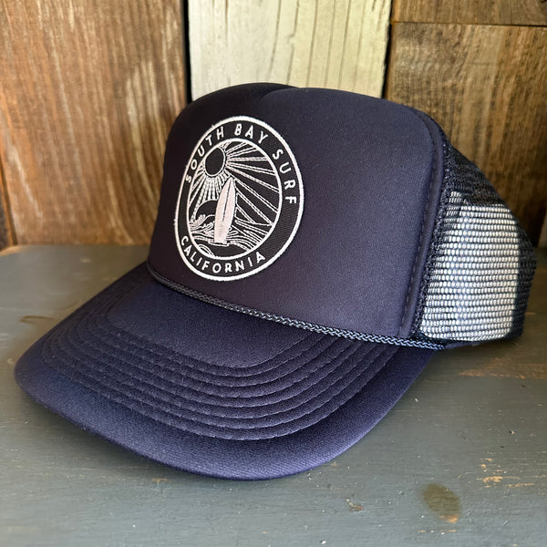 Hermosa Beach SOUTH BAY SURF (Navy Patch) Mid Crown Trucker Hat - Navy (Curved Logo)