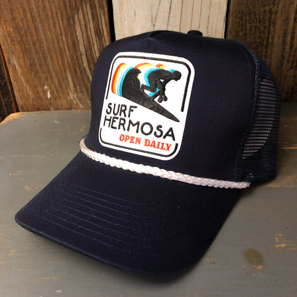 Hermosa Beach SURF HERMOSA :: OPEN DAILY 5 panel Rope Trucker Cap - Navy/White Braid (Curved Brim)