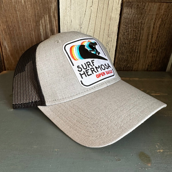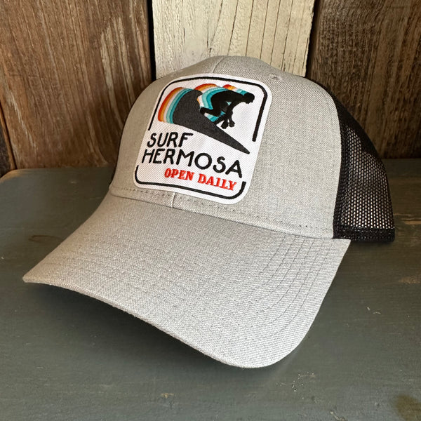 Hermosa Beach SURF HERMOSA :: OPEN DAILY 6 Panel Low Profile Mesh Back Trucker Hat - Black/Heather Gray