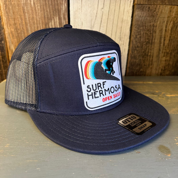 Hermosa Beach SURF HERMOSA :: OPEN DAILY 7 Panel Mid Profile Trucker Snapback Hat - Navy