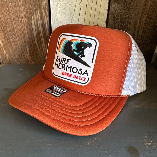 Hermosa Beach SURF HERMOSA :: OPEN DAILY High Crown Trucker Hat - Texas Orange/White