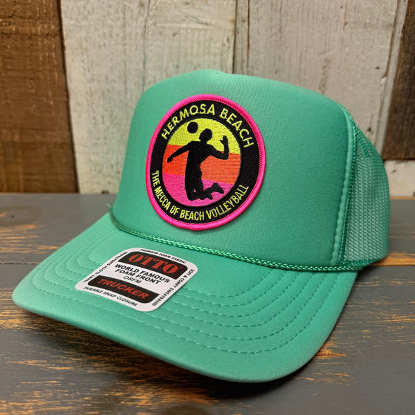 Hermosa Beach THE MECCA OF BEACH VOLLEYBALL Trucker Hat - Cactus Green