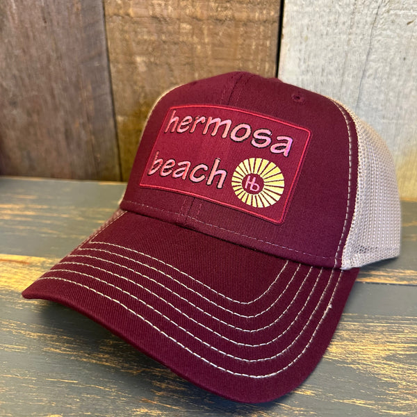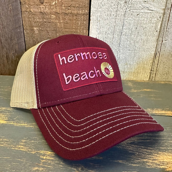 Hermosa Beach WELCOME SIGN 6 Panel Low Profile Mesh Back Trucker Hat - Maroon/Khaki