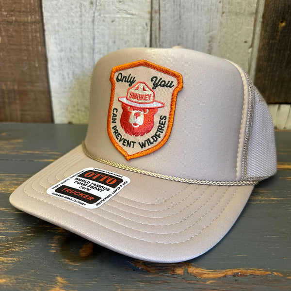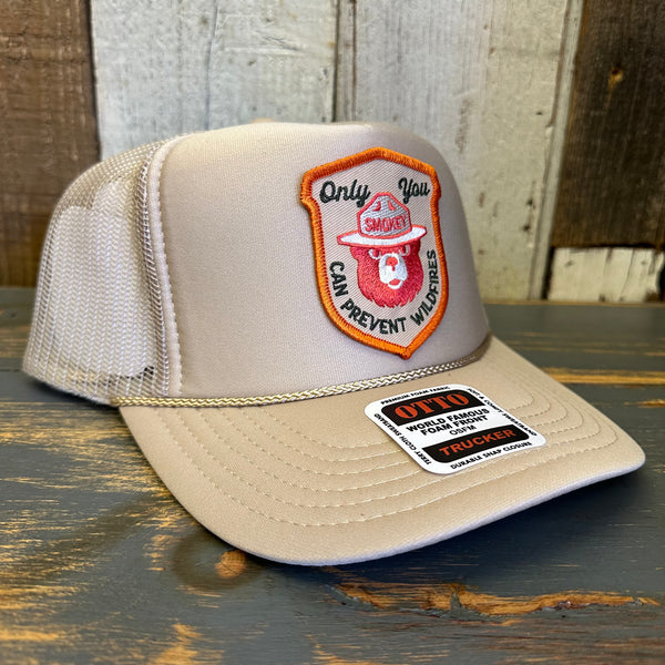 SMOKEY BEAR :: KEEP IT GREEN PREVENT WILDFIRES High Crown Trucker Hat - Khaki