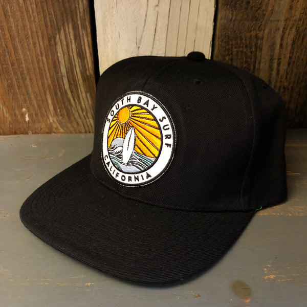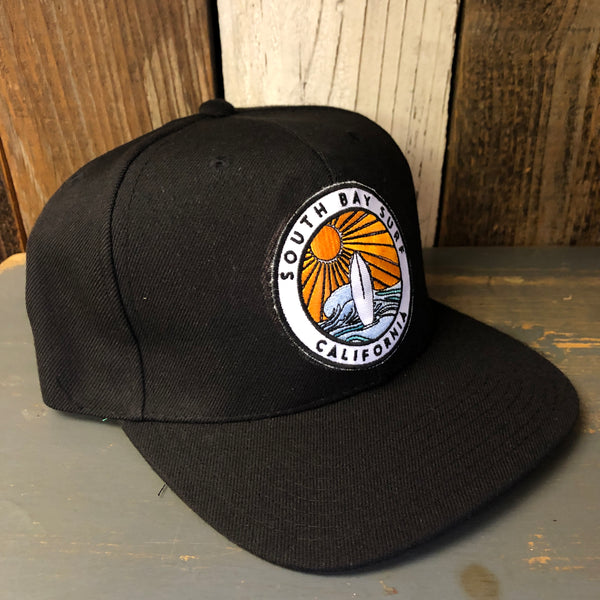 SOUTH BAY SURF (Multi Colored Patch) 6 Panel Wool Blend Flat Bill Hat - Black