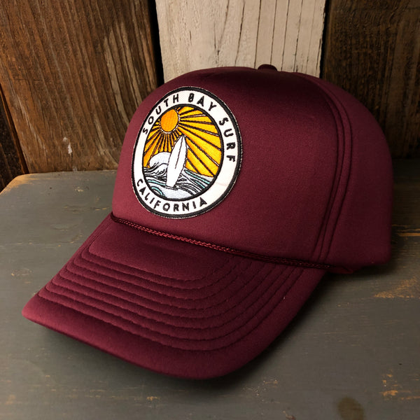 SOUTH BAY SURF (Multi Colored Patch) High Crown Trucker Hat - Maroon