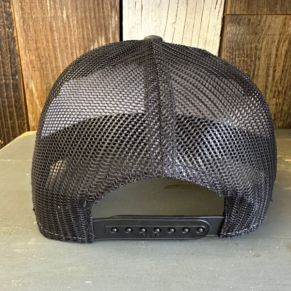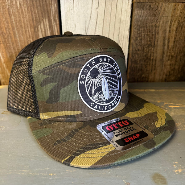 SOUTH BAY SURF (Navy Colored Patch) 7 Panel Mid Profile Trucker Snapback Hat - Camo/Black