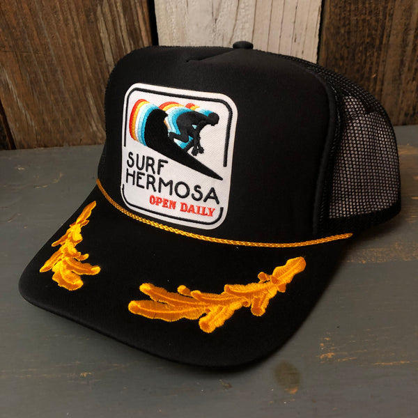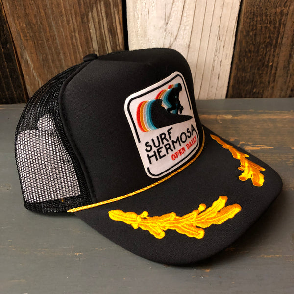 SURF HERMOSA :: OPEN DAILY 5 Panel High Crown Mesh Back Captain Trucker Hat- Black/Gold